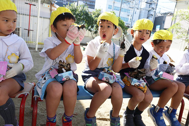 一人ずつ焼きいもをもらってお外でたき火を眺めながらいただきました。皮をむくと、きれいな黄色いさつまいもが出てきました。湯気も出ている熱々の焼きいもを大きな口でガブリ! 「おいし~い」