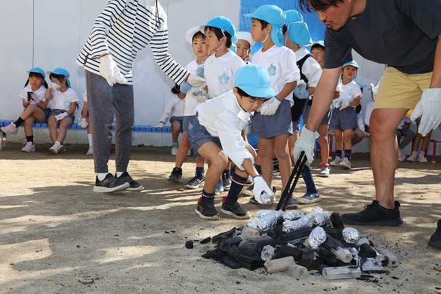 そして、年長組さん。自分でたき火の中においもを入れました。