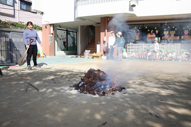 年長組さんが年少組さんや年中組さんにもおいもを分けてくれたので、先に年少組さんと年中組さんのおいもを焼きいもにしました。たき火を見たのが初めての子もたくさんいたかもしれません。