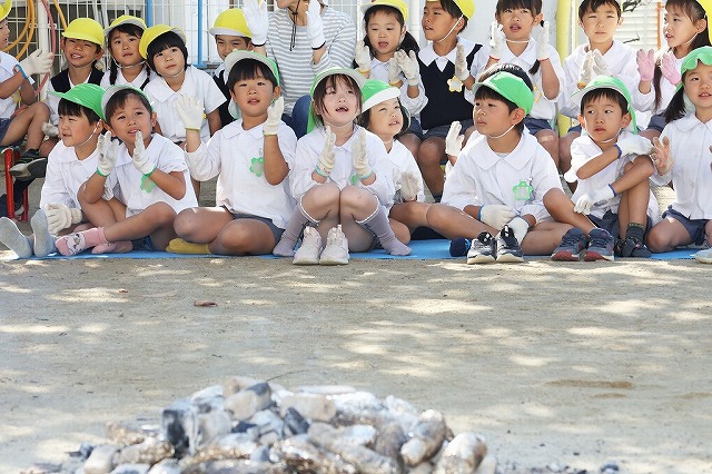 すごい煙やたき火を見ながらお友達と一緒に待ちました。すぐには焼けないので、焼きいもじゃんけんをしたり、おいもの歌を歌ったり・・・