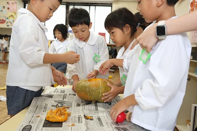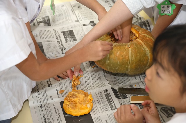 ハロウィンに先駆けて、保護者の方から頂いたかぼちゃを使って、さくら組さんがとってもかわいいランタンを作りました!!