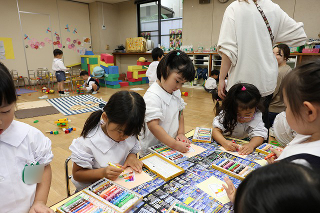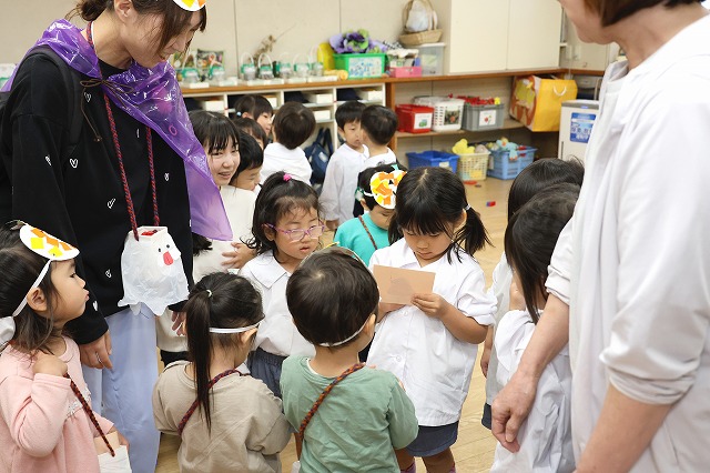 年少組さんでは、魔女の帽子の塗り絵をしたカードをもらいました。いつもは一番小さい年少組さんですが、今日はお姉ちゃんやお兄ちゃんになってプレゼント♪子ども達は自分立ちより小さいお友だちにうれしい気持ちと不思議な気持ち、照れくさい気持ちといろいろな顔が見られました。