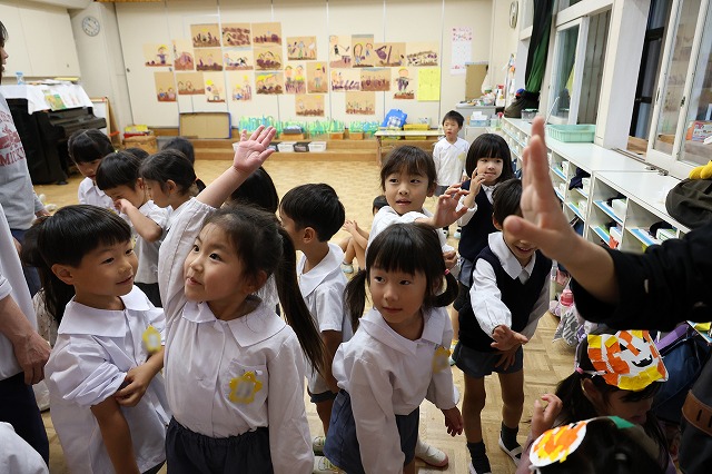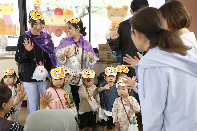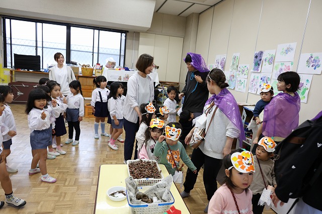 10月31日(金)ハロウィン当日には、隣接する安井ゆりの花保育園のお友達がかぼちゃのお面をかぶった仮想姿で安井幼稚園の各保育室に遊びに来てくれました!(^^)!