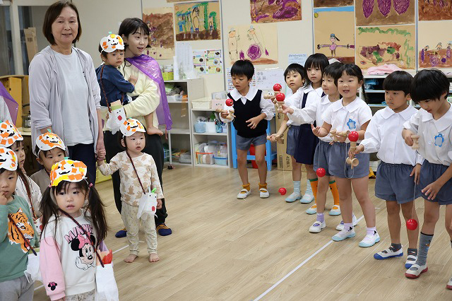 そして、2階のクラスにも順番に回りました。年長組さんの中には、何もあげるものがないから・・・「かわりにけん玉見せてあげるよ!」とけん玉を取り出して見せてくれたクラスもありました。小さいお友達もけん玉に見入っていました。