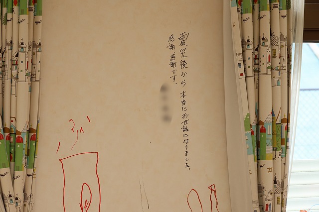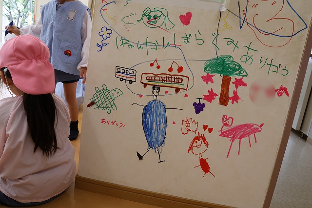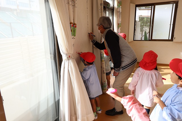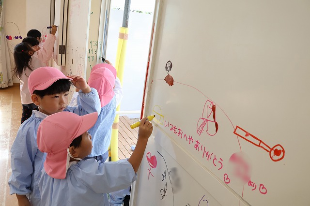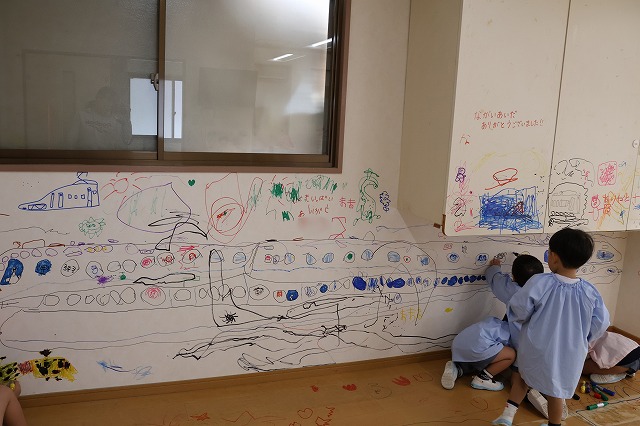 園舎の増改築工事のため、とうとう今日でばら組のお部屋とお別れする日が来てしまいました。最後の思い出にお部屋の床や壁に感謝の気持ちを込めてお絵描きをしました。