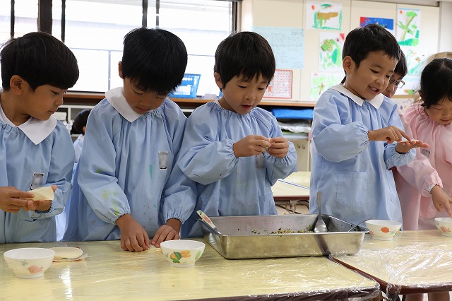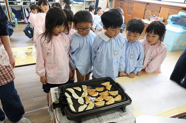 そして、ホットプレートで先生が焼いてくれている間に、もう一つづつ包んで給食のご用意。だんだんといい匂いがお部屋に広がってきて・・・こんがりおいしそうに焼きあがりました♪