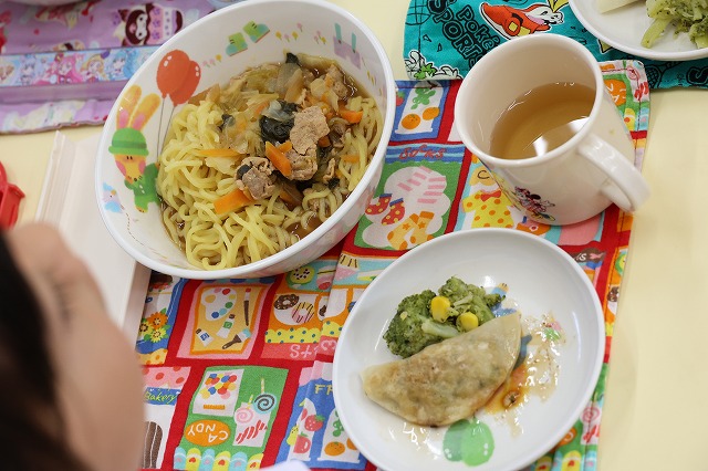 2つ目を焼いている間に、給食のラーメンやブロッコリーのサラダも入れてもらって一緒に食べました。