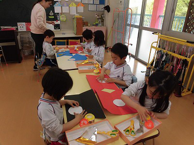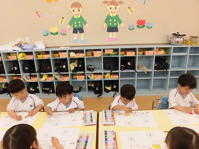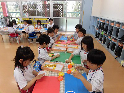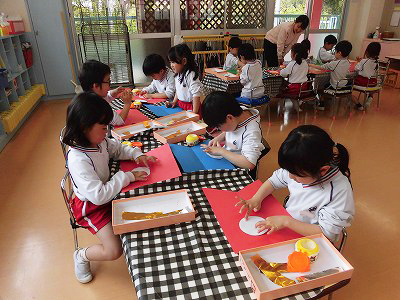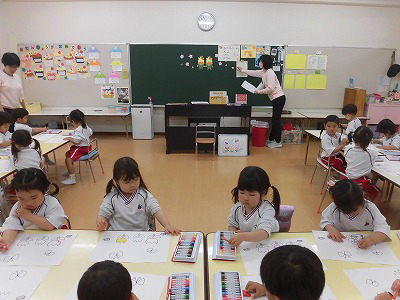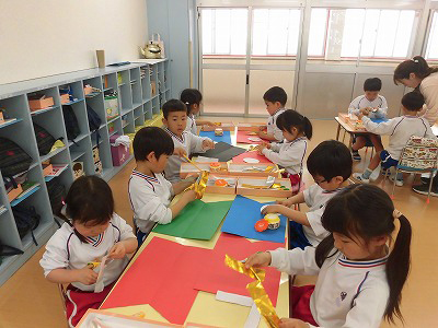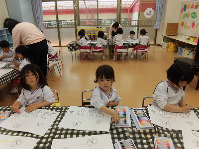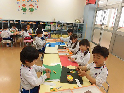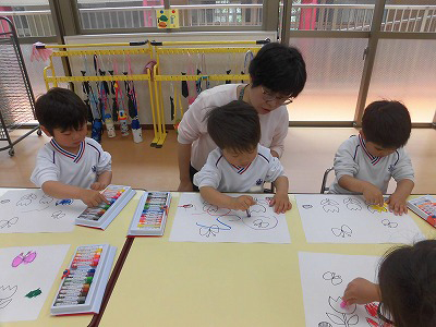 その後はハサミをしました。昨日一足先にハサミを使ったお友だちは今日は使い方の確認を、今日初めてハサミにふれたお友だちは先生と一緒に切り落としにチャレンジしましたよ♪
