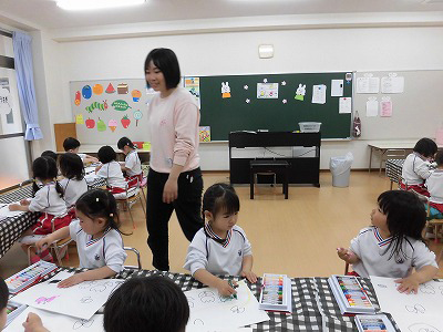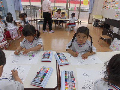 年少さんがチューリップの球根植えを行いました。まずは先生のお話を聞きます。