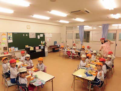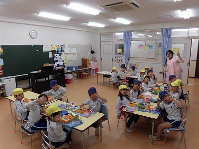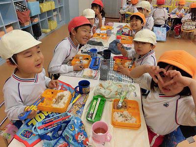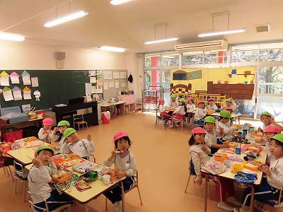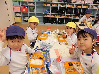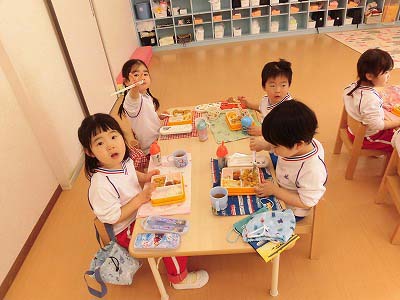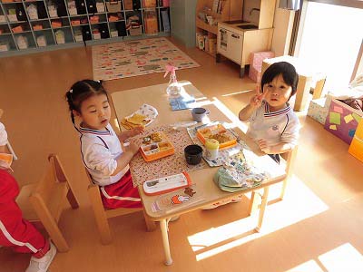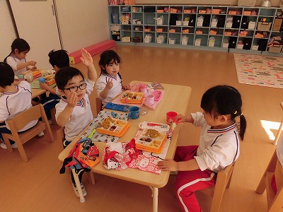 進級に向け、クラスをこえて友だちの輪を広げるきっかけになれば…とこういう機会を設けています。少しずつですが違うクラスのお友だちとお喋りしたり、食後に一緒に遊ぶ姿も見られるようになってきましたよ♪