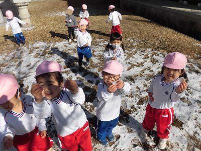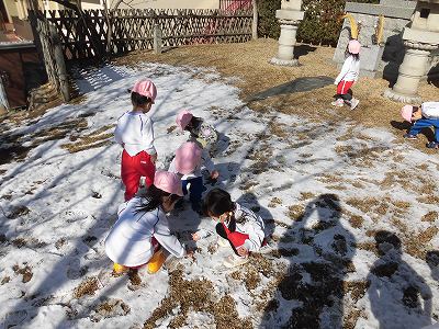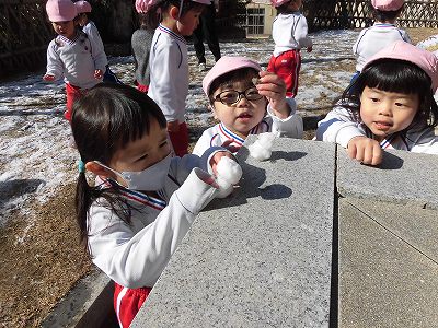 園庭の雪は朝のうちに溶けてしまったのですが、園の敷地内にある開山堂にはまだ雪がある!ということで雪遊びに出かけたみんな♪