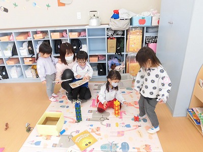 今日は「あそびワーク」を楽しんだ子どもたち♪終わった後はおもちゃや絵本でゆったりと遊びました。「ねえ、これ見て~!」と自分からお友だちに話しかけたり、「はいどうぞ!」と積み木を渡してくれたり、友だち同士のコミュニケーションが日々上手になっているこあらさんです☆