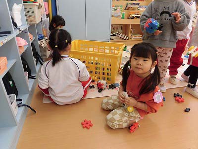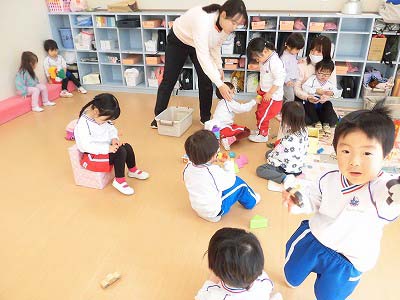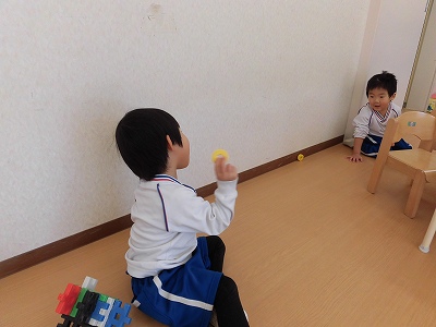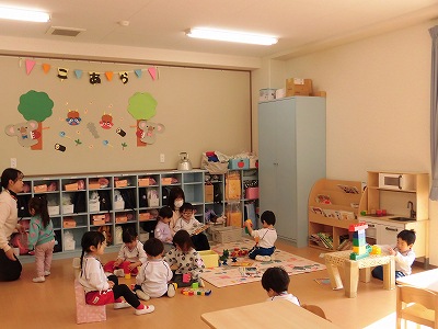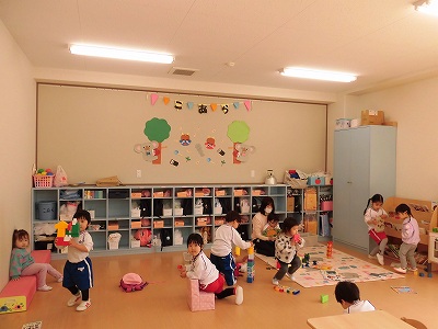 お部屋ではお友だちや先生と楽しく遊んでいるこあらさん。ブロック遊びや絵本などそれぞれに好きな遊びを楽しんでいます。お友だちと丸いブロックを転がし合って盛り上がる姿も♪
