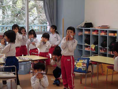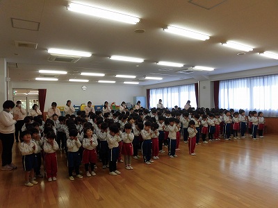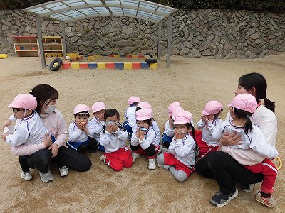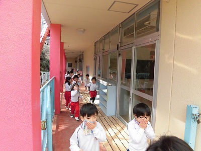 そして給食も終わったころ…火災を知らせるベルが鳴りました。お部屋で遊んでいたクラスもあれば、外遊びに出ていたクラスもありましたが、みんなすぐに動きを止めハンカチで口をふさぎながら先生の指示を聞くことが出来ました!