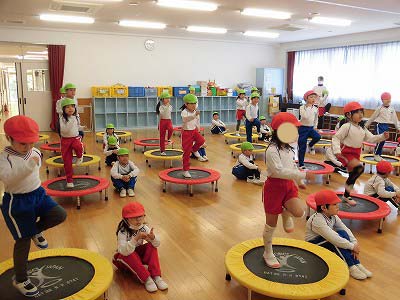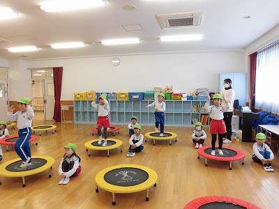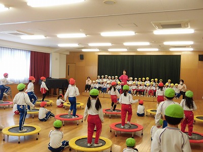 れんげ組とさくら組は年少さんにトランポリンを披露しました!年下のお友だちにかっこいいところを見せようといつもより気合が入っている様子。音楽に合わせて軽快に跳んでいましたよ♪