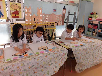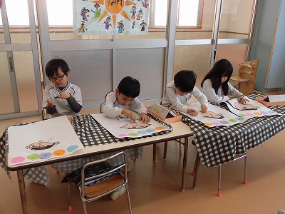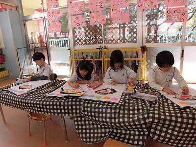 すみれ組も同じくカレンダーの表紙づくりです。ブラウスの襟やネクタイの描き方などを確認しながら丁寧に描く姿がありました♪