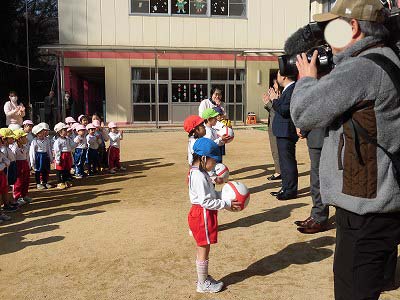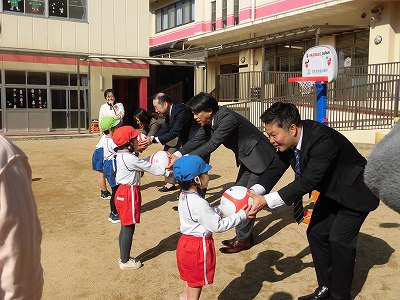 三井住友信託銀行様よりバスケットボール普及活動の一環としてミニバスケットゴールとボールを幼稚園に寄贈して頂きました。今朝はその贈呈式です!(サンテレビに取材して頂きました)