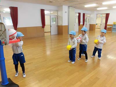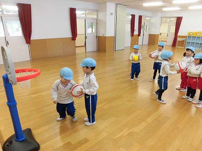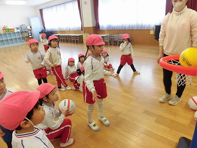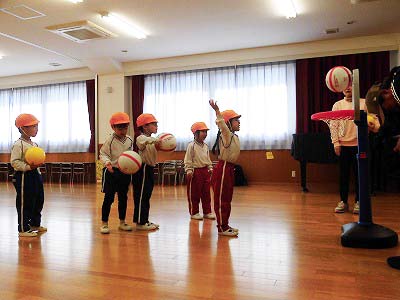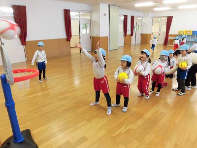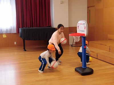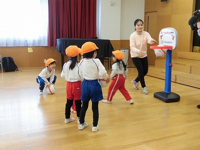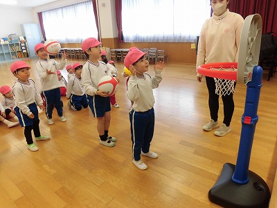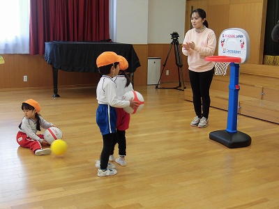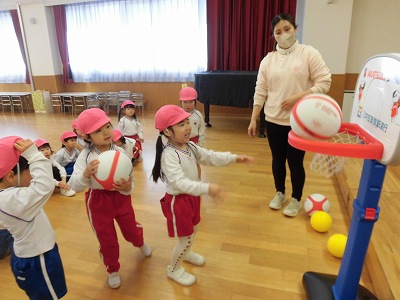 「バスケットボール知ってる!」「あれで遊んでいいの?」「私もやりたい!」と子どもたち。早く遊びたくてワクワクしているのが伝わってきました☆