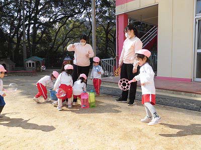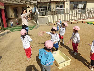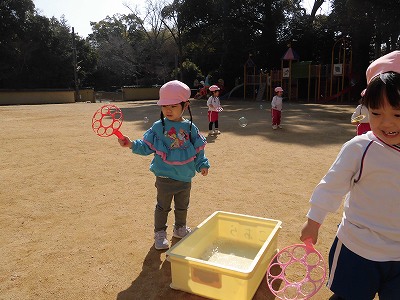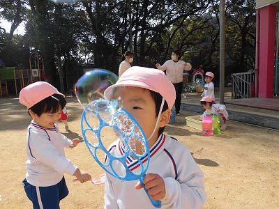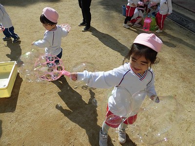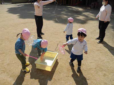 先週末、こあらさんはシャボン玉あそびを楽しみました!先生がロープで作ったシャボン玉を「キャ~♡」と追いかけたり、自分たちでシャボン玉を作ったり…とっても楽しそうな子どもたちでした♪
