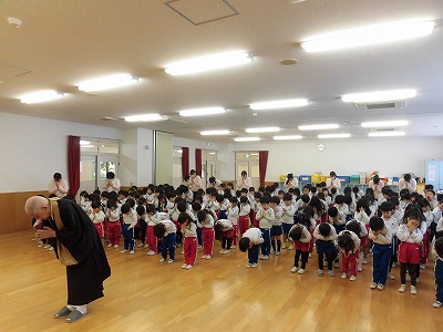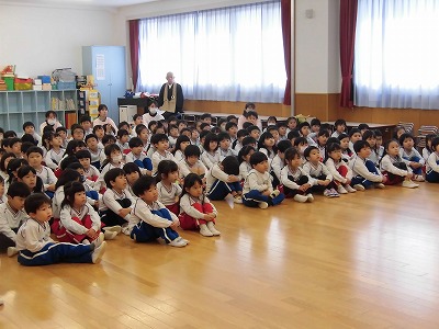 理事長先生からお釈迦様が亡くなったときのことや、お釈迦様がみんなに残してくれた教えについてお話を聞きました。「お釈迦様が亡くなった時、たくさんの人や動物達が悲しんだんだよ。」「みんなも自分の命はもちろん、小さな花や虫の命などすべての命を大切にして、毎日明るく・仲良く・正しいことをして過ごそうね。」というお話でした。