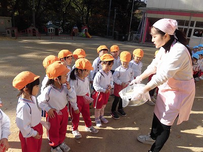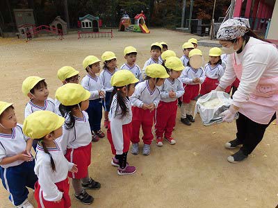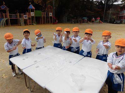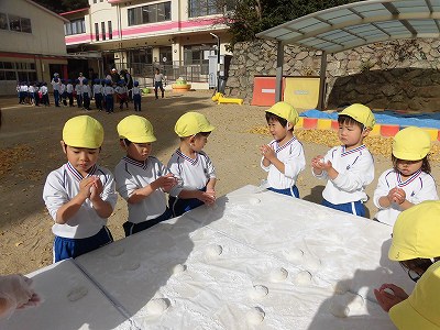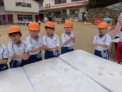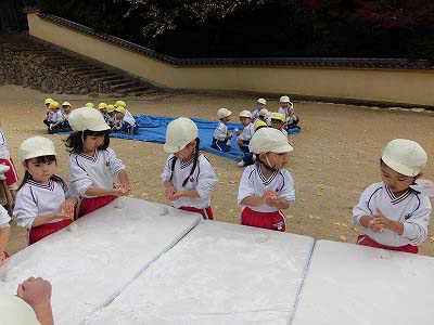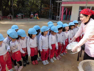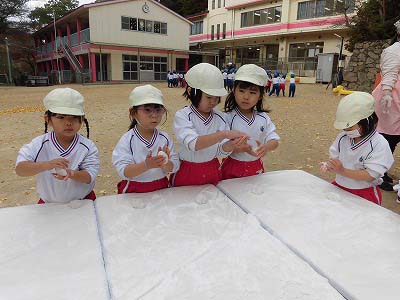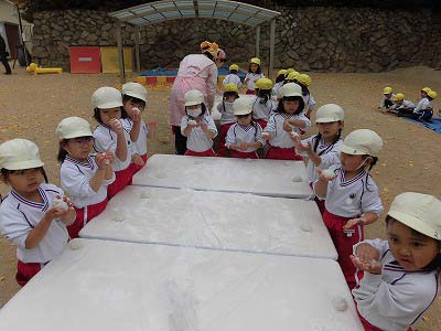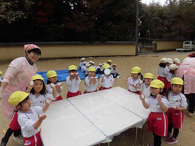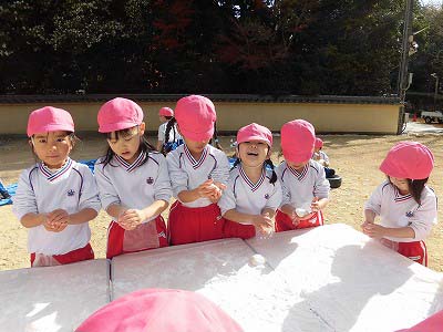 出来上がったお餅は先生たちがすばやく小分けに。みんなはこの間に手洗い・消毒を済ませました。