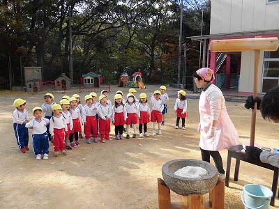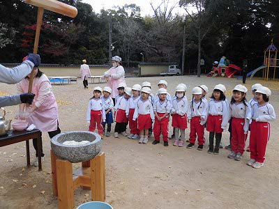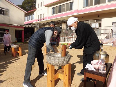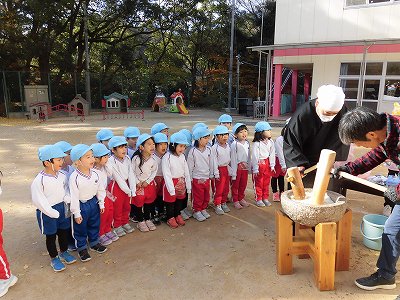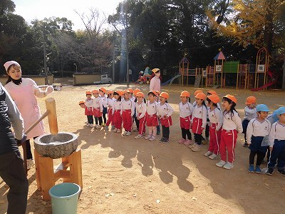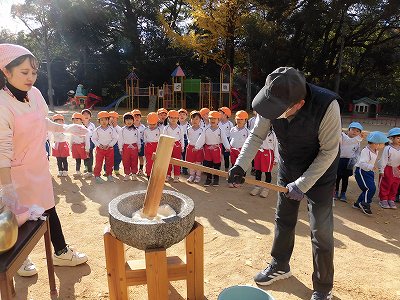 今日は子どもたちが楽しみにしていたおもちつき!朝から園庭に臼などが準備されているのを見てワクワクしていた子どもたちです。各クラスもちつきの順番が回ってくるとテンション高く園庭へ!