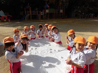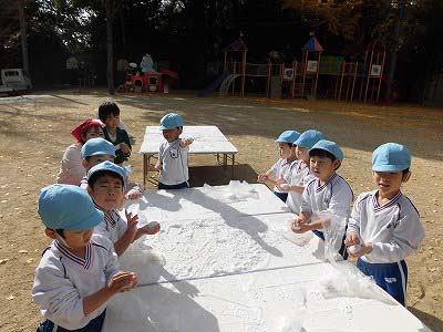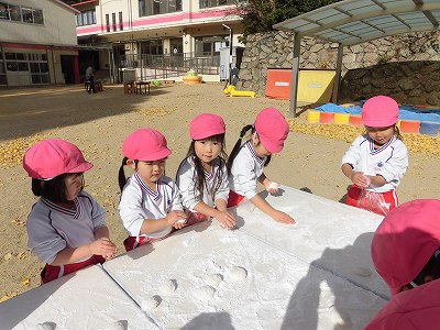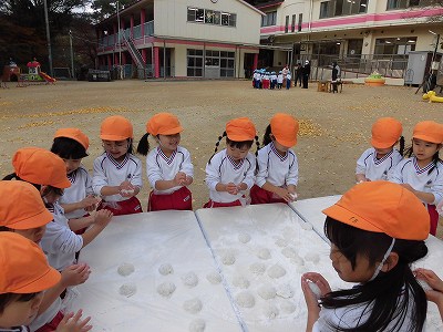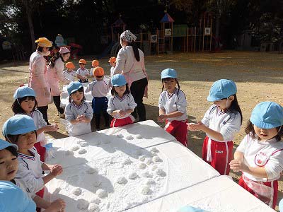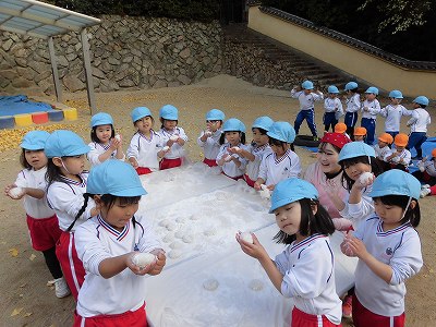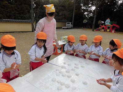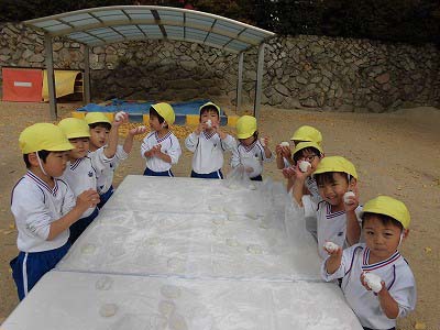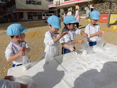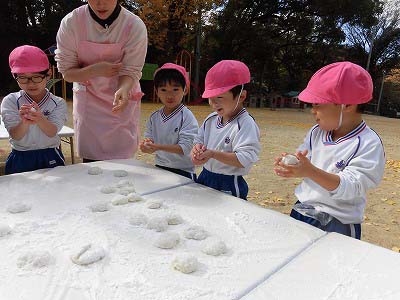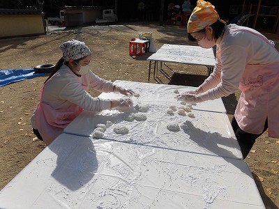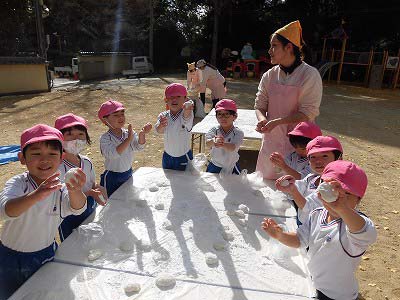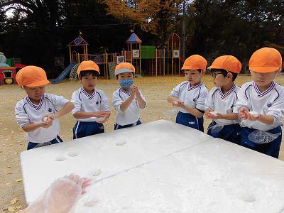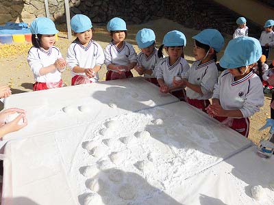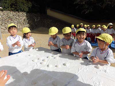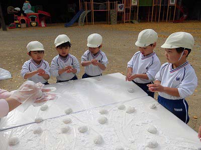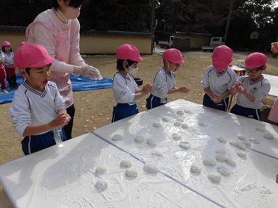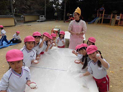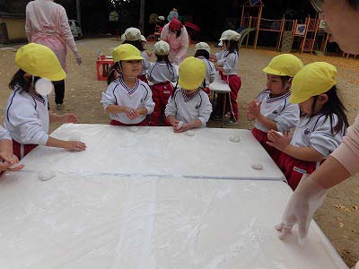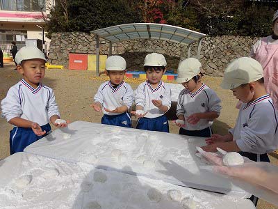 ここからは子どもたち自身が自分でお餅を丸めていきます。「俺、大きいのがいい!」とどのお餅が大きいかじっくりと選んでからおもちに手を伸ばす子どもたち(笑)選んだお餅を「ふわふわ~♡」と言いながら優しく丸めました。