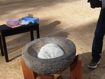 まずは蒸したもち米を見せてもらいました。「これが今からお餅に変わっていくんだよ!」と聞き「へ~!!」「お米がお餅になるの?」と見つめる子どもたちでした。