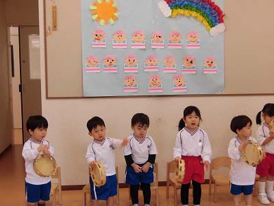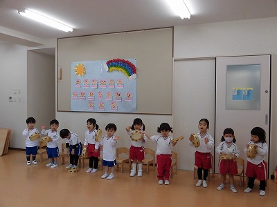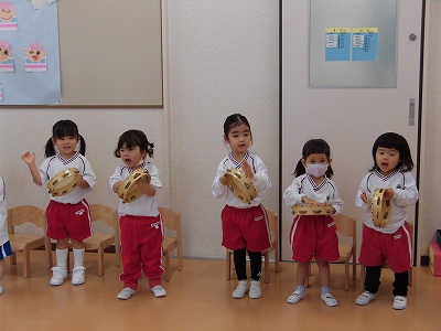 こあら組さんはタンバリン奏を披露しました。お兄ちゃん・お姉ちゃんが拍手してくれて嬉しかったね♡