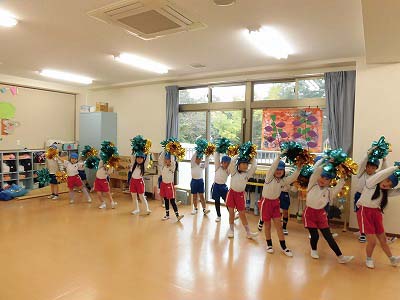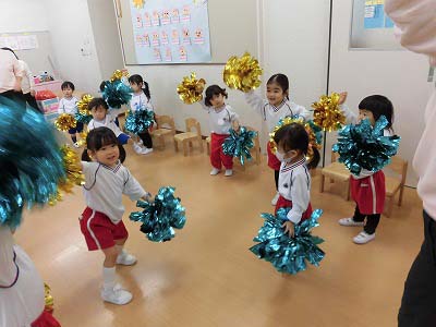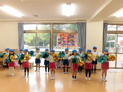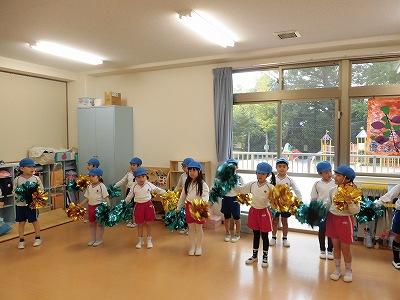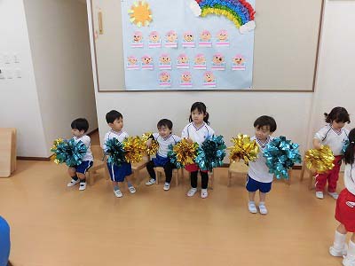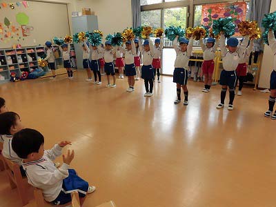 あやめ組さんは運動会の時のダンスを披露してくれました。ポンポンを持ってかっこよく踊る年長さんに釘づけのこあらさん。思わず真似して踊り出す子もいましたよ!