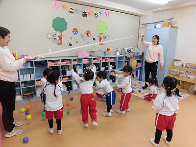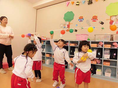 こあら組さんはボールを使ったお楽しみです♪先生たちが持っているテープにボールを貼り付けて…