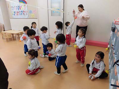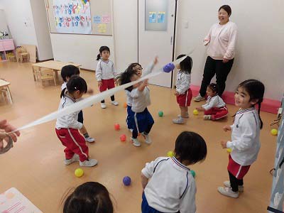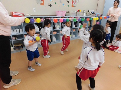 振ると…ボールが上からパラパラと落ちてきて、子どもたちは「キャー!♡」と大盛り上がりでした!!