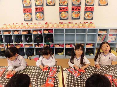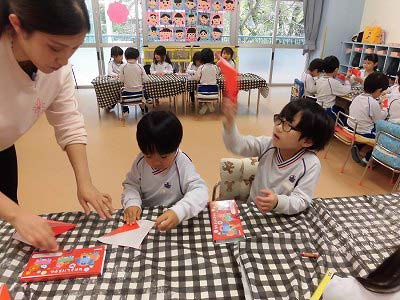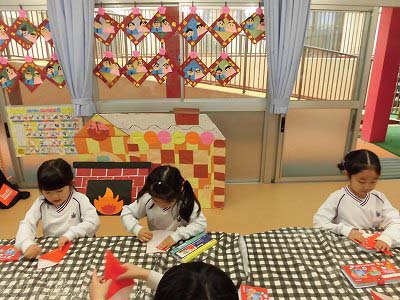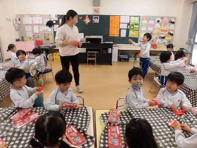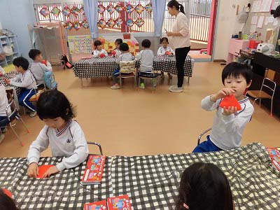 折り紙で「いちご」を折っています。「こっち向き?」「合ってる?」とお友だちと確認しあいながらにぎやかに折り紙を楽しんでいました♪