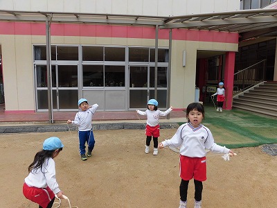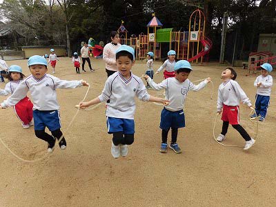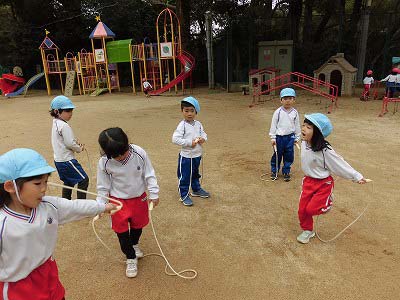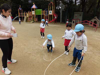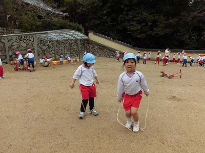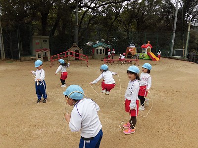 縄とびを頑張りました!ぴょんぴょんと続けて跳べるお友だちが以前より増えてきています♪後ろ跳びにチャレンジしている子もいましたよ!