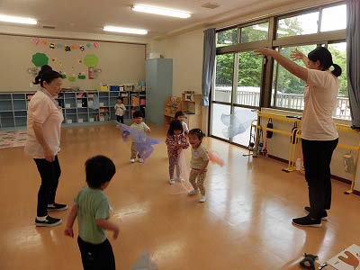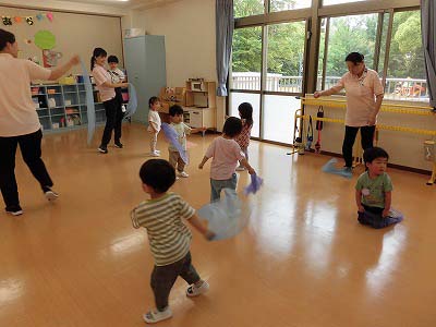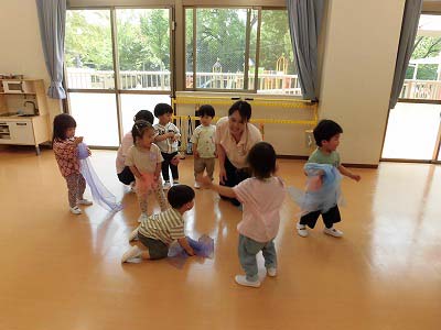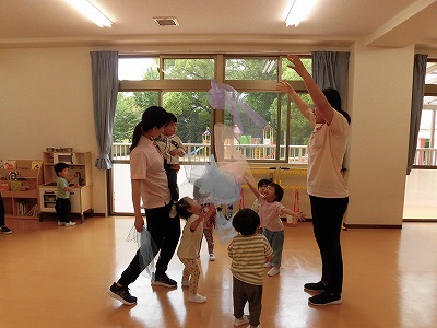 カラースカーフを使って遊んだよ!投げてみたり、振ってみたり…音楽に合わせて自由に動かしてみたりといろんな遊び方を楽しみました♡