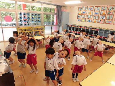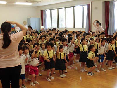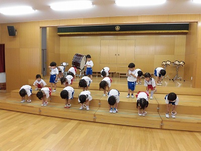 朝はみんなで体操から!暑さに負けず元気いっぱい体を動かします。(終わった後は涼しいお部屋に戻りたっぷり水分補給しました☆)