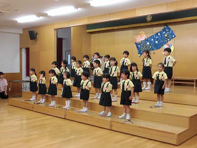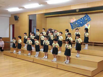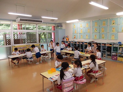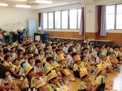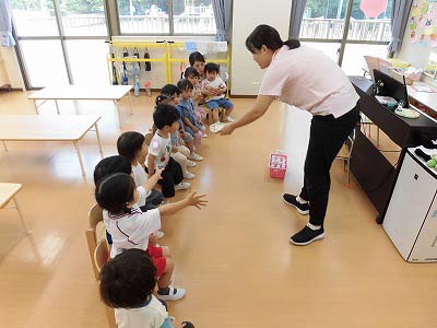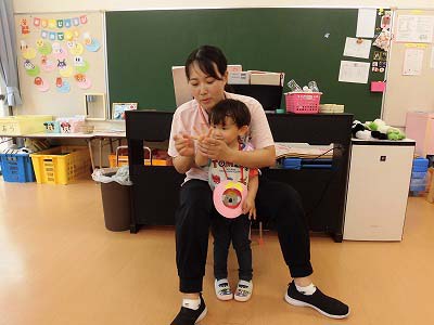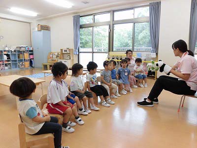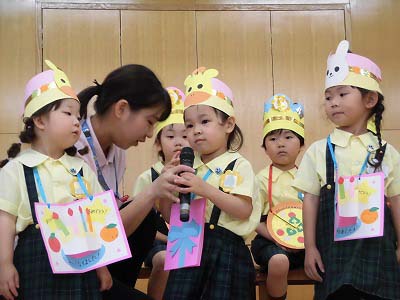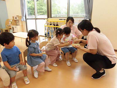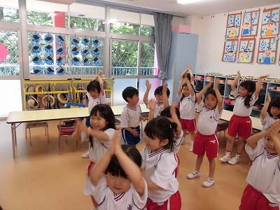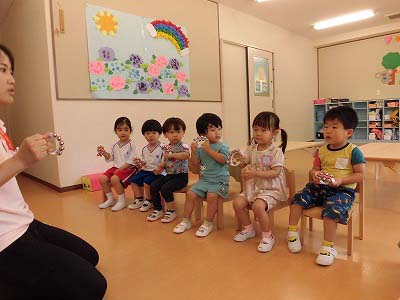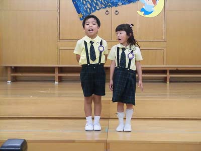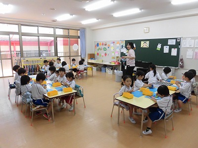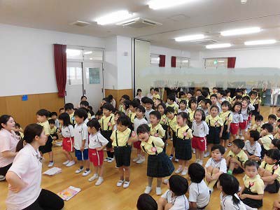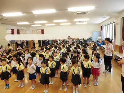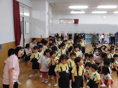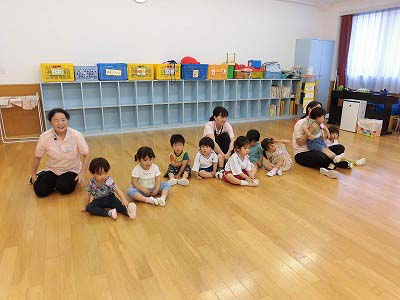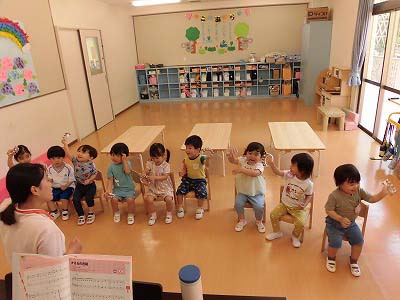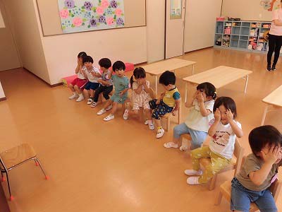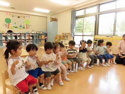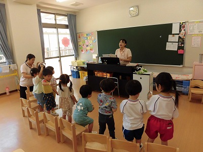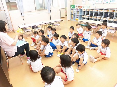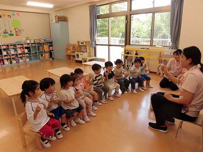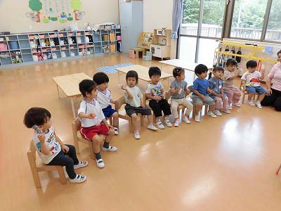 朝の歌や挨拶、お名前呼びなどの流れをすっかり覚えてきた子どもたち。おちついて椅子に座ってお話を聞いてくれていますね♪