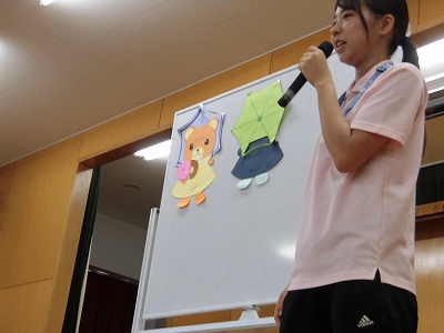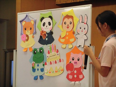 次々と傘をさしてやってくる動物たち。「カエルや!」「これはブタちゃう?」と子どもたちも楽しそうに考えてくれました♪最後は無事に全員集合。みんなが持ってきてくれたお菓子やケーキで素敵なパーティーになりました♡
