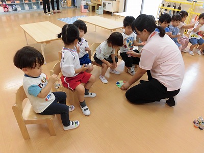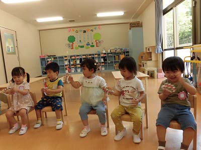 今日はマラカスを作りました。自分で好きなビーズなどを選んでペットボトルに入れていきます。フタをしめたらシャカシャカ~!と嬉しそうに全力で振り始める子どもたち。最後は「カエルのうた」をみんなで演奏しました♪