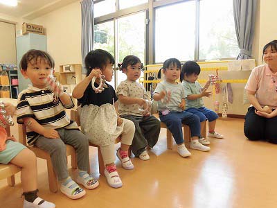 お部屋では「すず」に挑戦!初めてすずに触るお友だちも昨日体験したお友だちも、みんな嬉しそうにシャンシャン鳴らしていました♪全力で腕を振ってすずを鳴らす姿が可愛かったです♡