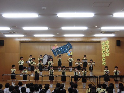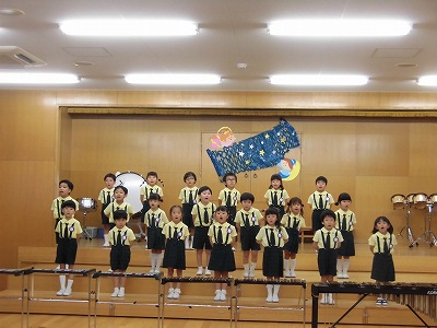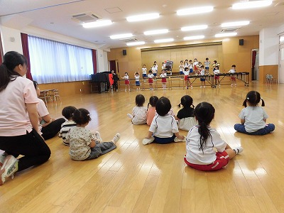 ホールへ上がり、れんげ組とうさぎ組の音楽会練習の❝お客さん❞をしました!年長さんの迫力ある合奏に思わず見入っていたみんな。演奏の後には拍手を送っていました♪