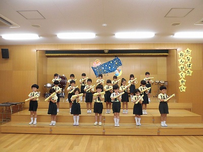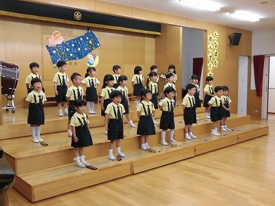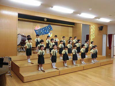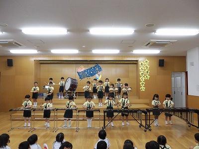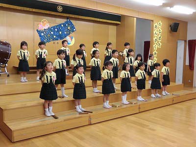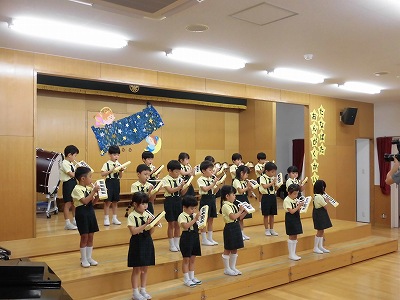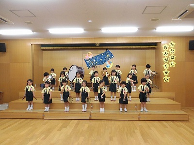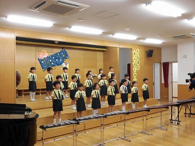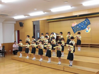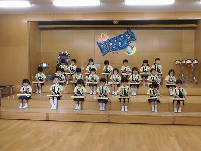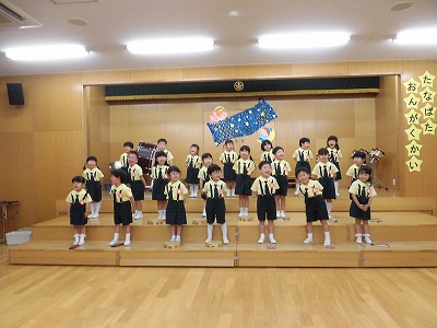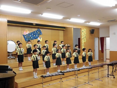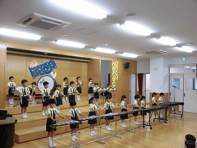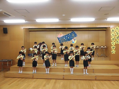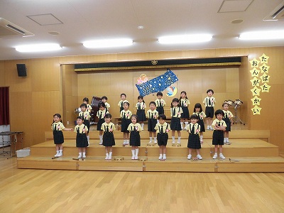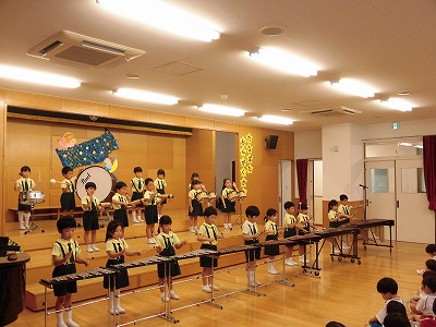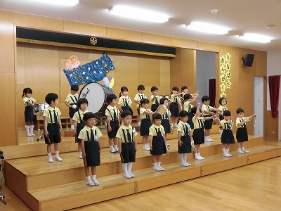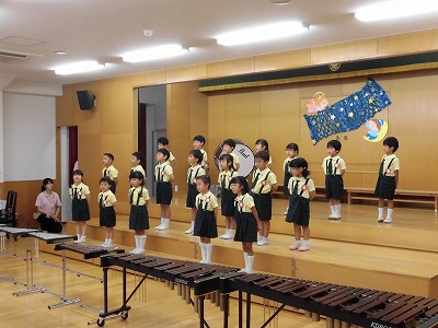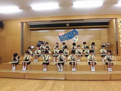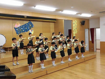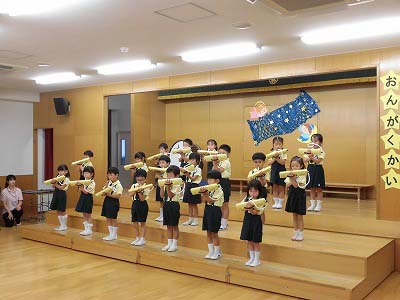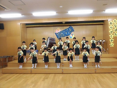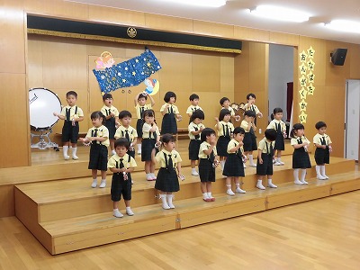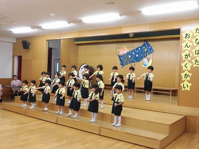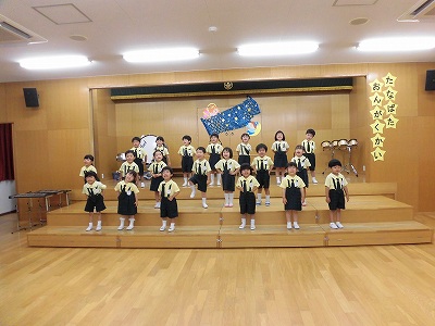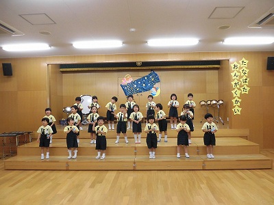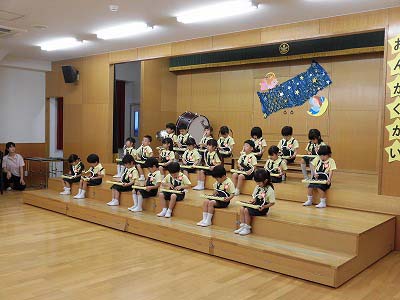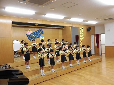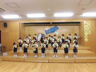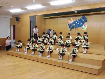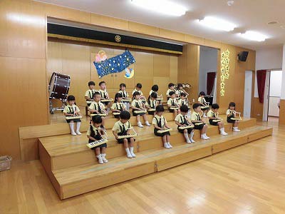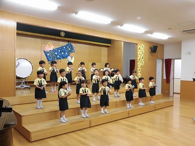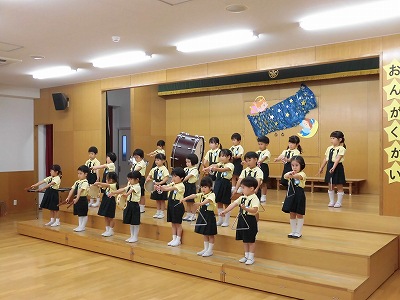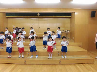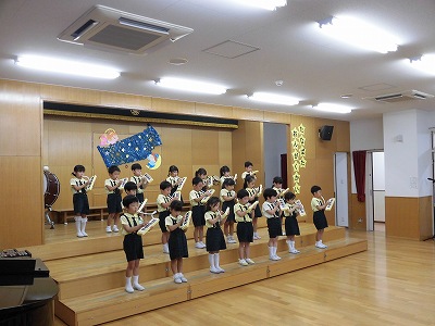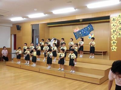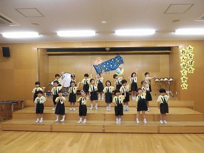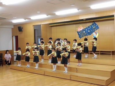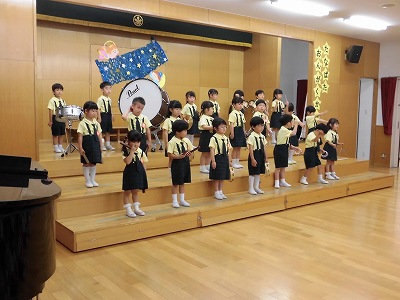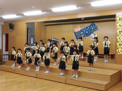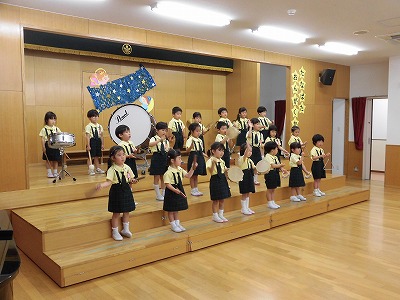きりんぐみはホールで音楽会のおけいこです!今日は2歳児こあらキッズのみんなが❝お客さん❞になってくれました。自分たちより小さなお友だちを前に、歌も楽器も張り切るきりん組さんでした☆