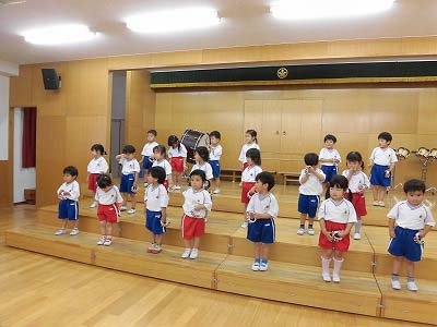 ホールへ上がり、年少きりんぐみの音楽会練習の❝お客さん❞をしました。みんなで手拍子をしたりしながら楽しそうに見学。「(おにいちゃん・おねえちゃんたち)楽しそうにやってるね~!」という子もいましたよ♪
