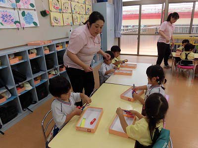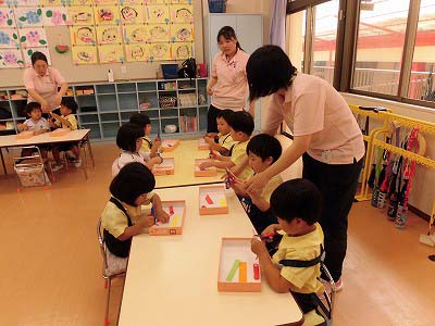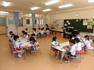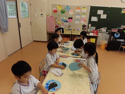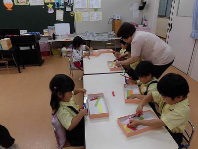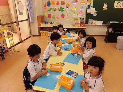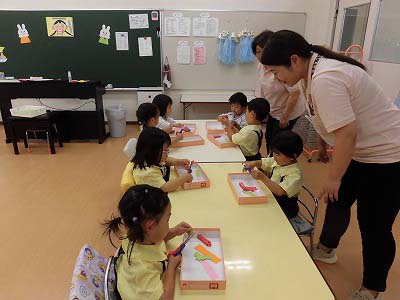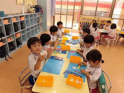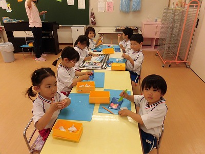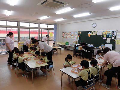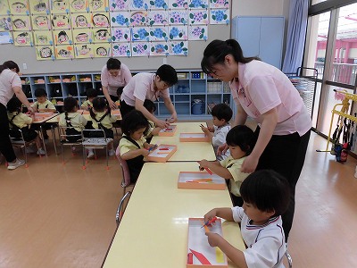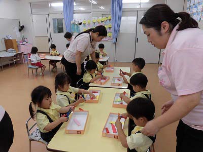 年少さんは3色の色画用紙をハサミで切りました。たくさんの先生に見守られながら集中してハサミを持つ子どもたち…。「全部切れた!」と嬉しそうに見せてくれました☆