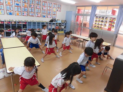 今日は初めておにいちゃん・おねえちゃんたちと一緒に朝の体操に参加しました!先生の動きをまねっこしながら楽しそうに体を動かしていましたよ♪