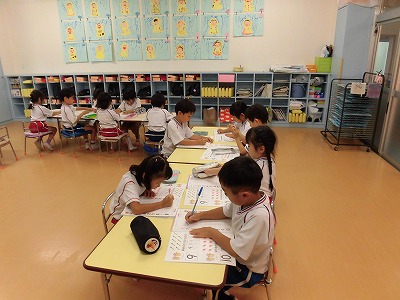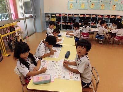 文字のワークをしました。今日は1から5の数字の書き方を覚えました。それまでにぎやかだったれんげさんもワークが始まるとシーンと静かに集中していましたよ!