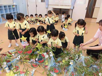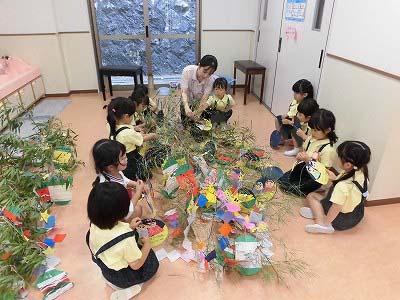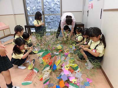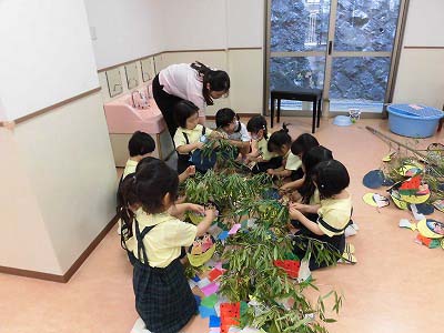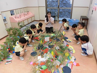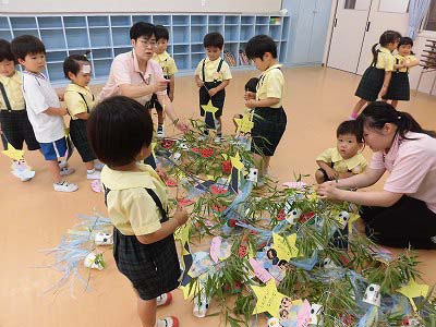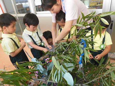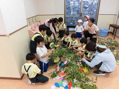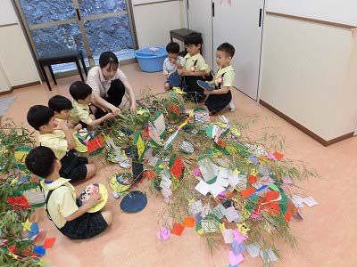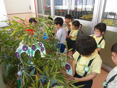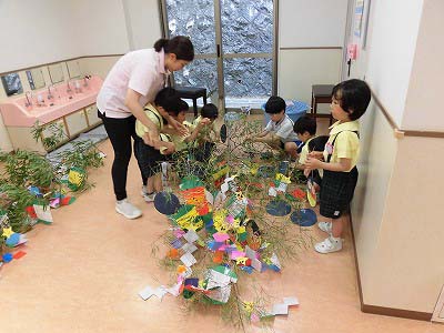 今日は笹に飾りや短冊をつけました♪みんなはどんな願い事を書いたのかな?