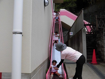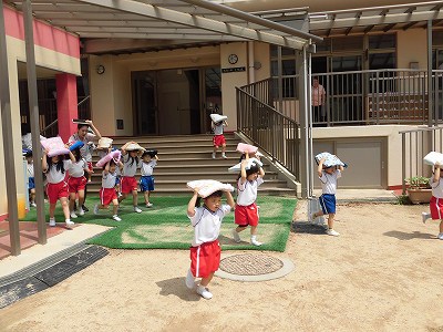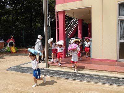 揺れがおさまったら座布団で頭を守りながら園庭へ避難開始です「お(押さない)・は(走らない)・し(喋らない)・も(戻らない)・よ(よく聞く)」の約束を守りながら避難します!教室の位置によっては緊急用すべり台で避難するクラスもあります。