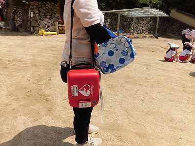 先生たちは避難時、名簿と非常持出袋、AEDなどを持っていきます。