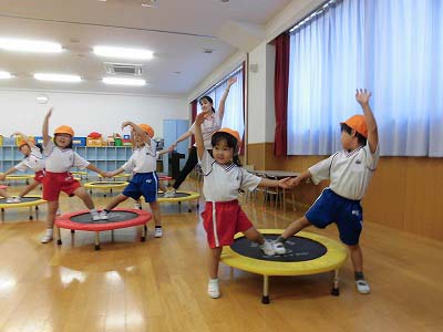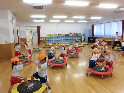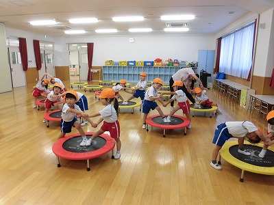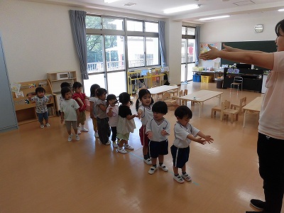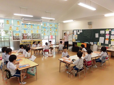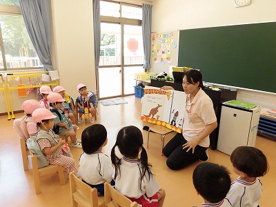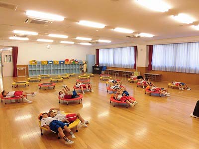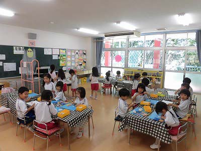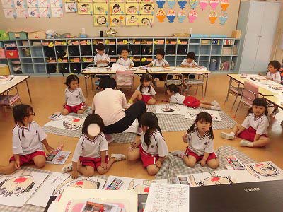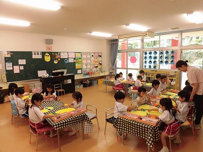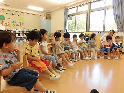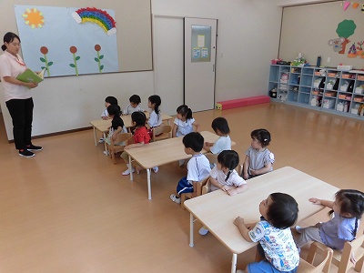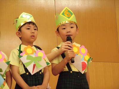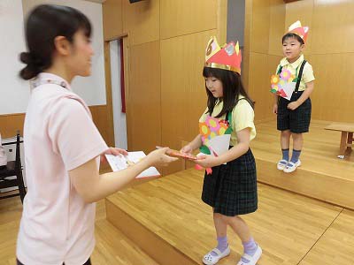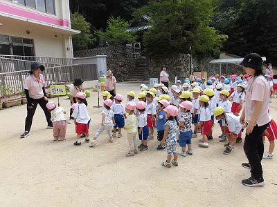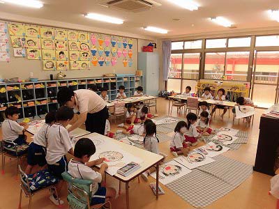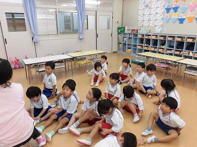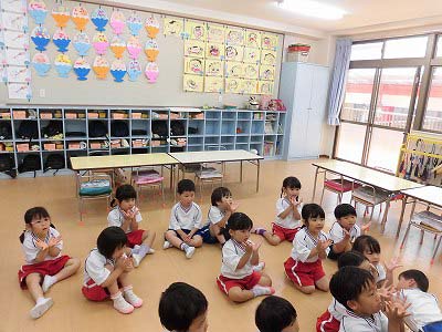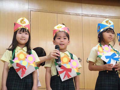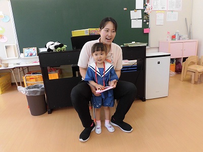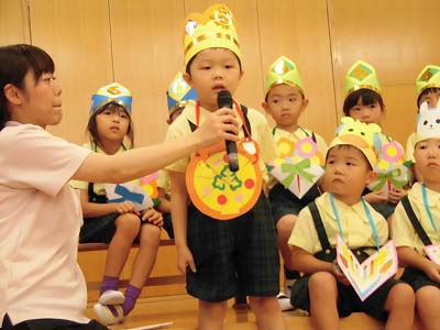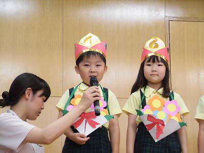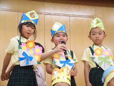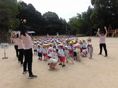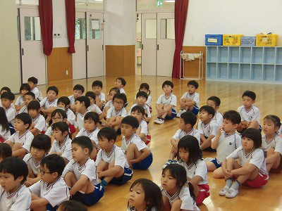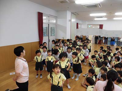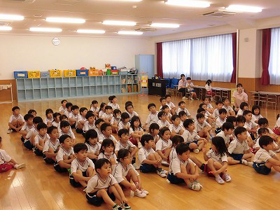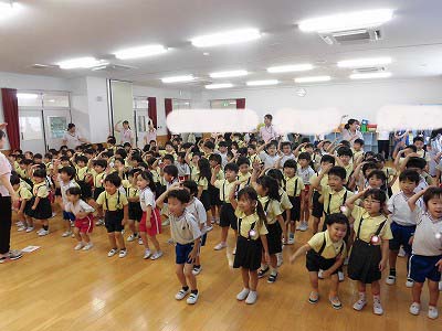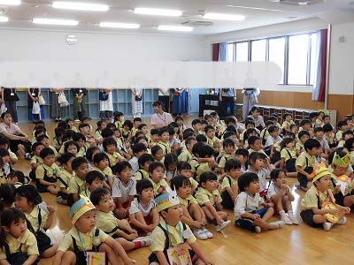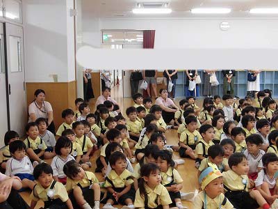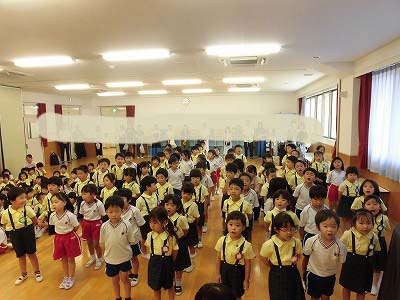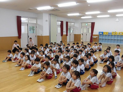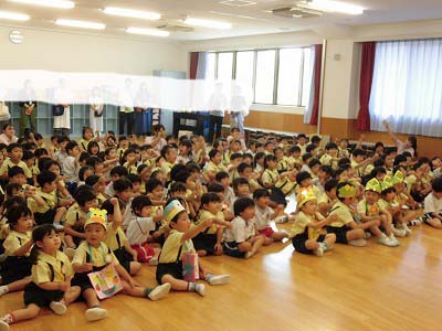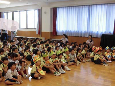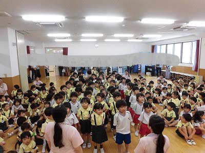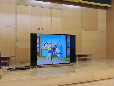 ホールに集まった年長さん。視線の先には…ドラえもん!